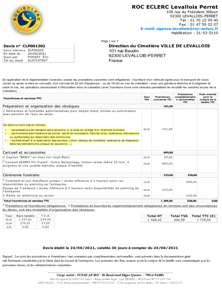 Pour remplir le dossier Roc Eclerc Levallois Perret, il faut fournir les informations demandées concernant le défunt, ainsi que les choix concernant les prestations funéraires.