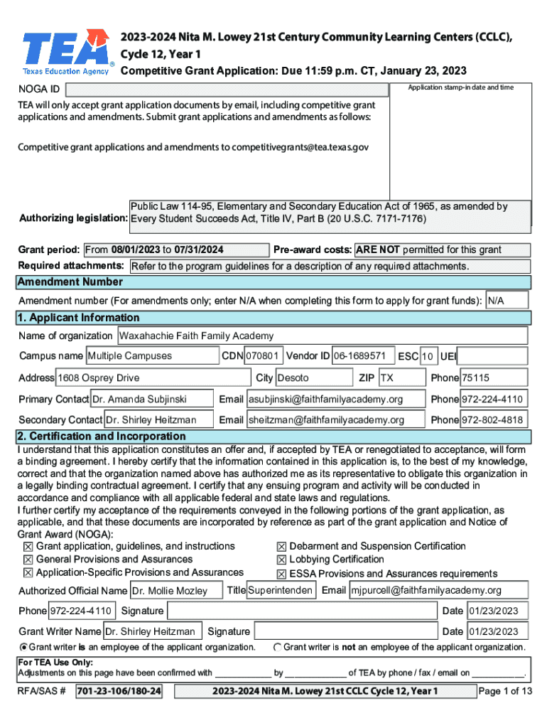 20232024 Nita M. Lower 21st Century Community Learning Centers (CCC), Cycle 12, Year 1 Competitive Grant Application: Due 11:59 p.m. CT, January 23, 2023, NOVA Application stamping date and time will