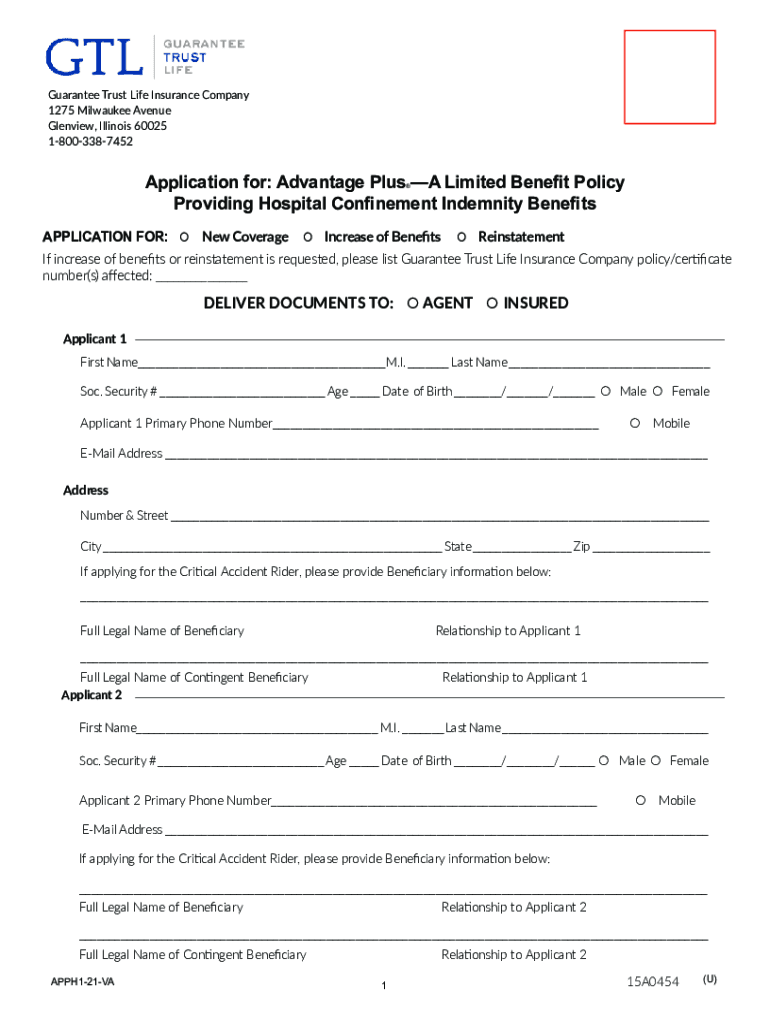 Guarantee Trust Life Insurance Company 1275 Milwaukee Avenue Glenview, Illinois 60025 18003387452Application for: Advantage Plus A Limited Benet Policy Providing Hospital Confinement Indemnity Benet's