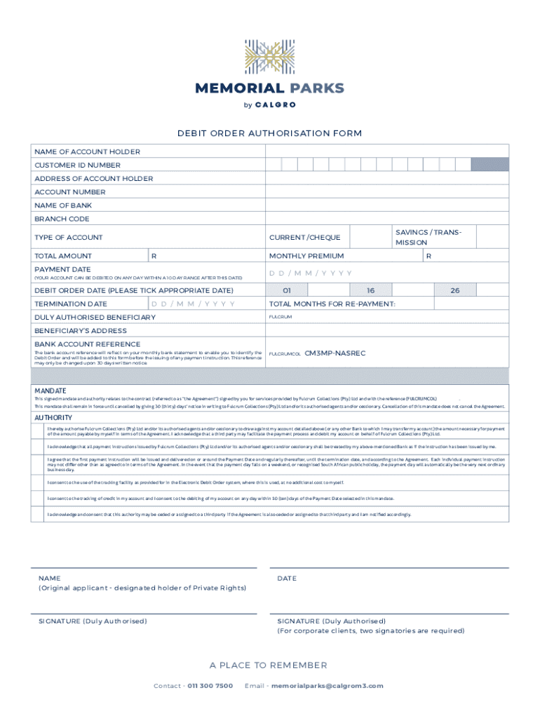 DEBIT ORDER Authorization FORM NAME OF ACCOUNT HOLDER CUSTOMER ID NUMBER ADDRESS OF ACCOUNT HOLDER ACCOUNT NUMBER NAME OF BANK BRANCH CODE TYPE OF ACCOUNT TOTAL AMOUNTRPAYMENT DATESAVINGS / TRANSMISSIONMONTHLY