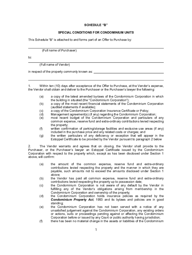 SCHEDULE B SPECIAL CONDITIONS FOR CONDOMINIUM UNITS This Schedule B is attached to and forms part of an Offer to Purchase by: (Full name of Purchaser) to: (Full name of Vendor) in respect of the property