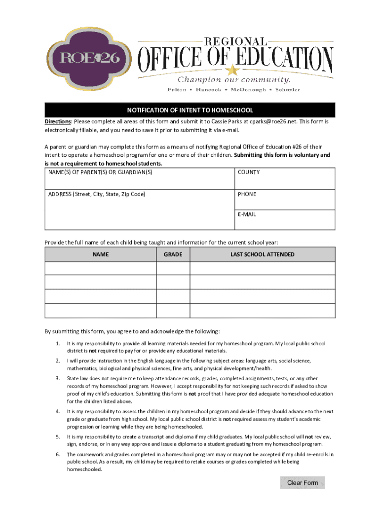 NOTIFICATION OF INTENT TO HOMESCHOOL Directions: Please complete all areas of this form and submit it to Cassie Parks at cparks@roe26.net. This form is electronically fillable, and you need to save