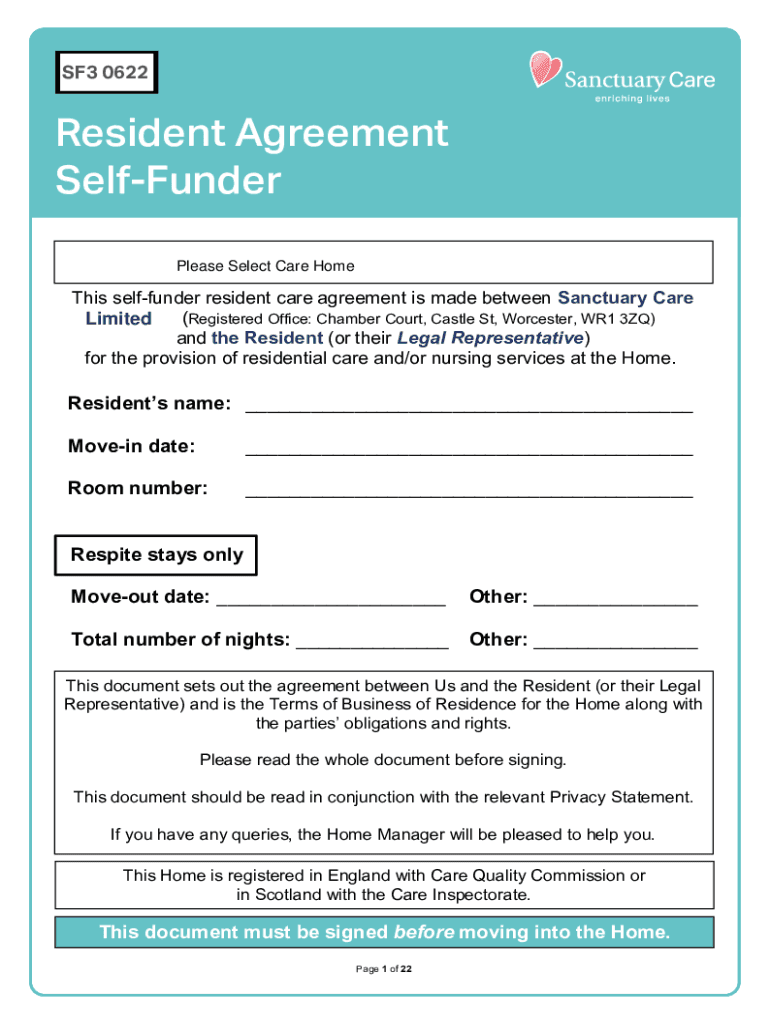 SF1 12/20SF3 0622Resident Agreement Resident Agreement SelfFunder Please Select Care Home NAME HOMESF1HEREThis selffunder resident care agreement is made between Sanctuary Care Limited (Registered