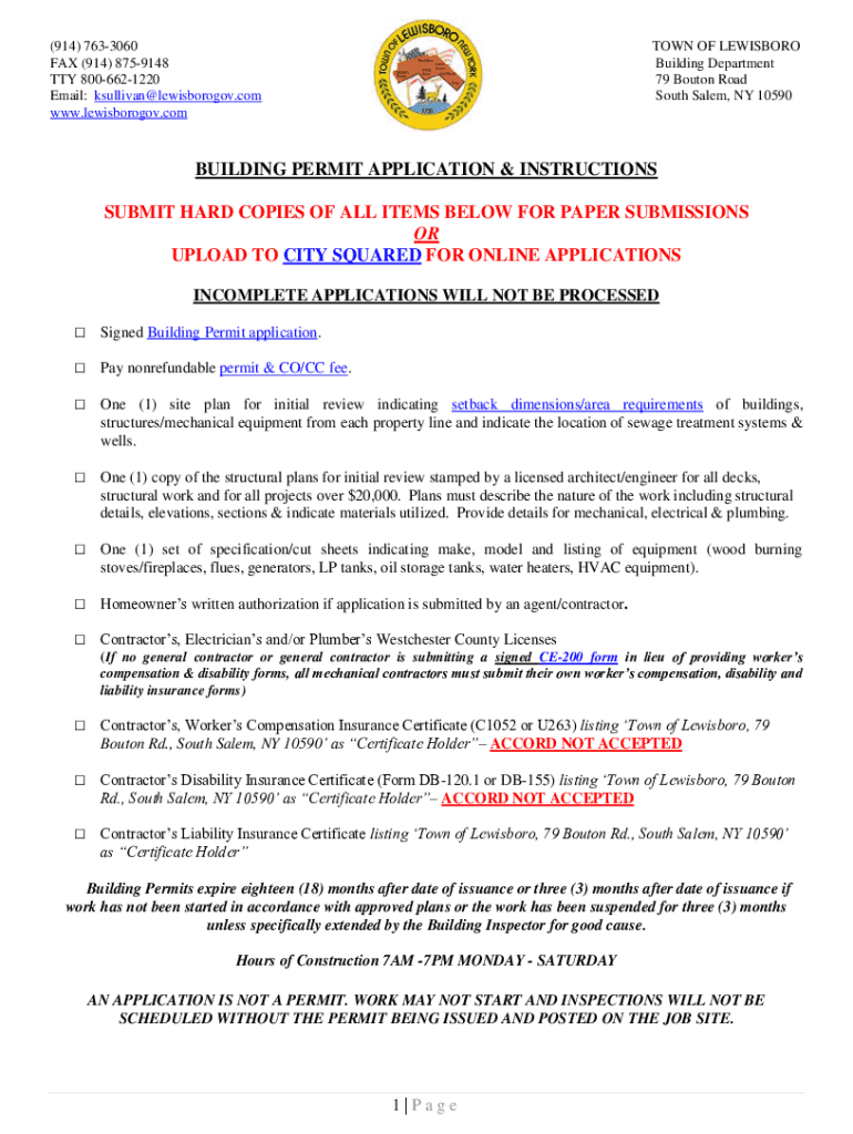 (914) 7633060 FAX (914) 8759148 TTY 8006621220 Email: ksullivan@lewisborogov.com www.lewisborogov.comTOWN OF LEWISTON Building Department 79 Boston Road South Salem, NY 10590BUILDING PERMIT APPLICATION