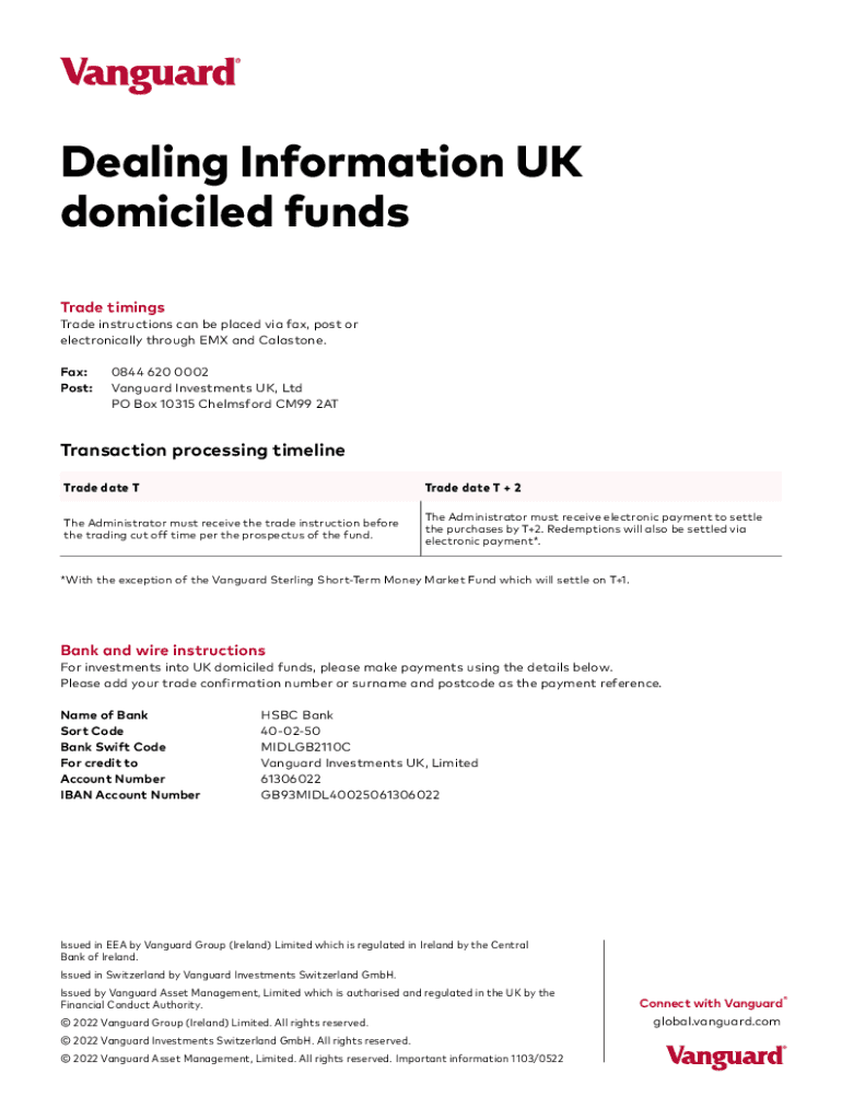 Dealing Information UK domiciled funds Trade timingsTrade instructions can be placed via fax, post or electronically through EX and Capstone. Fax:0844 620 0002 Post:Vanguard Investments UK, Ltd PO