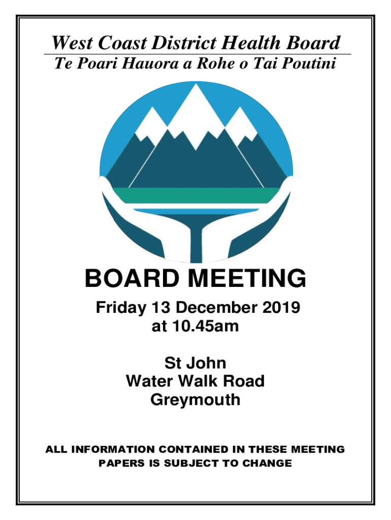 West Coast District Health Board Te Part Laura a Role o Tai PoutiniBOARD MEETING Friday 13 December 2019 at 10.45am St John Water Walk Road Grey mouths ALL INFORMATION CONTAINED IN THESE MEETING PAPERS