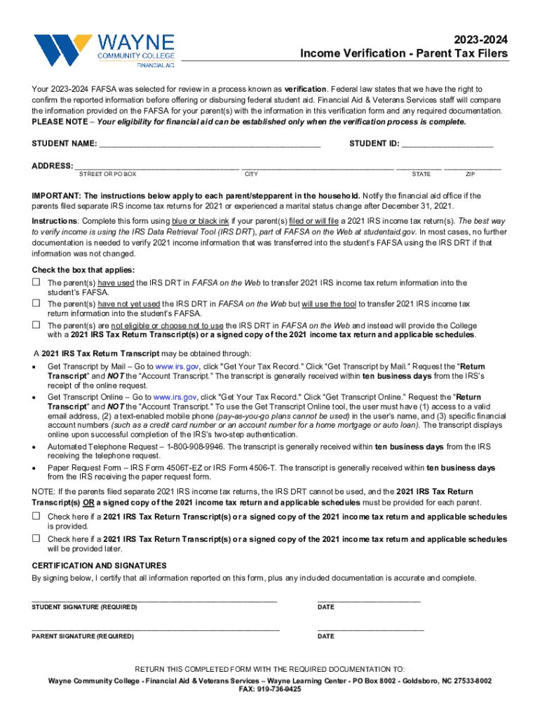 20232024 Income Verification Parent Tax Filers Your 20232024 FAFSA was selected for review in a process known as verification. Federal law states that we have the right to confirm the reported information