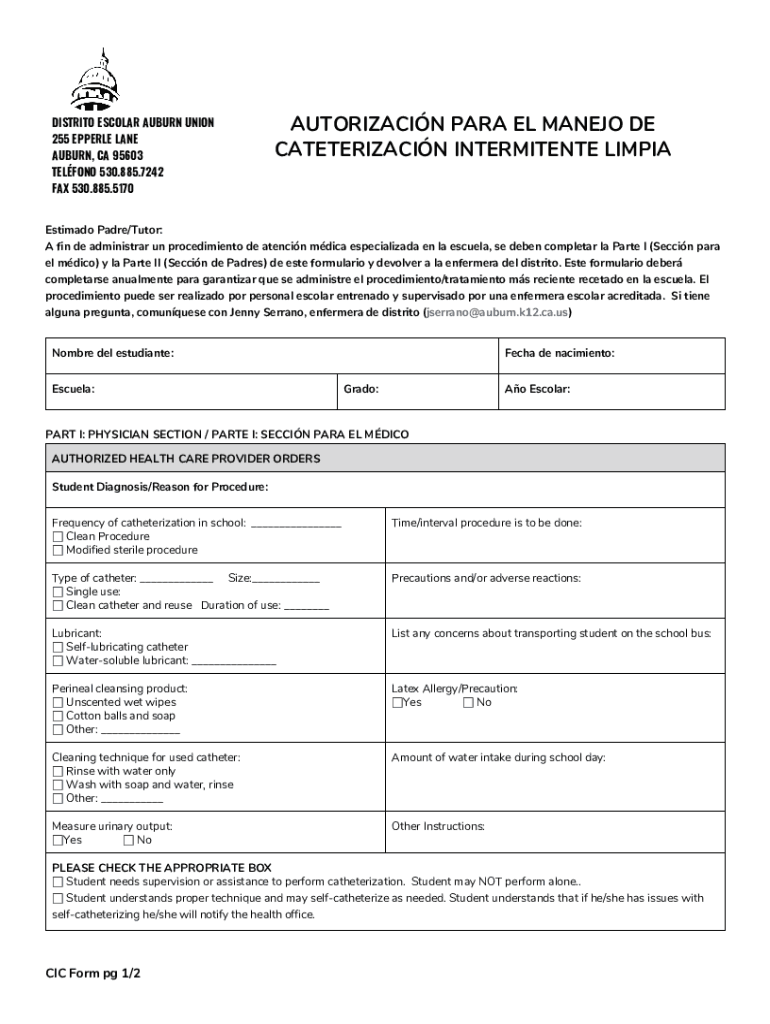 DISTRICT ESCOLAR AUBURN UNION 255 EBERLE LANE AUBURN, CA 95603 BELONG 530.885.7242 FAX 530.885.5170AUTORIZACIN PARA EL MANE JO DE CATHETERIZATION INTERMITTENT LIMPIAEstimado Padre/Tutor: A fin DE