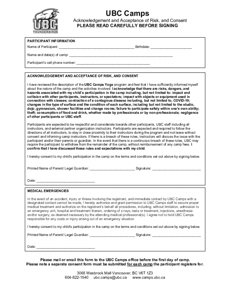 UBC Camps Acknowledgement and Acceptance of Risk, and Consent PLEASE READ CAREFULLY BEFORE SIGNING PARTICIPANT INFORMATION Name of Participant: ___ Birthdate: ___ Name and date(s) of camp: ___ Participants