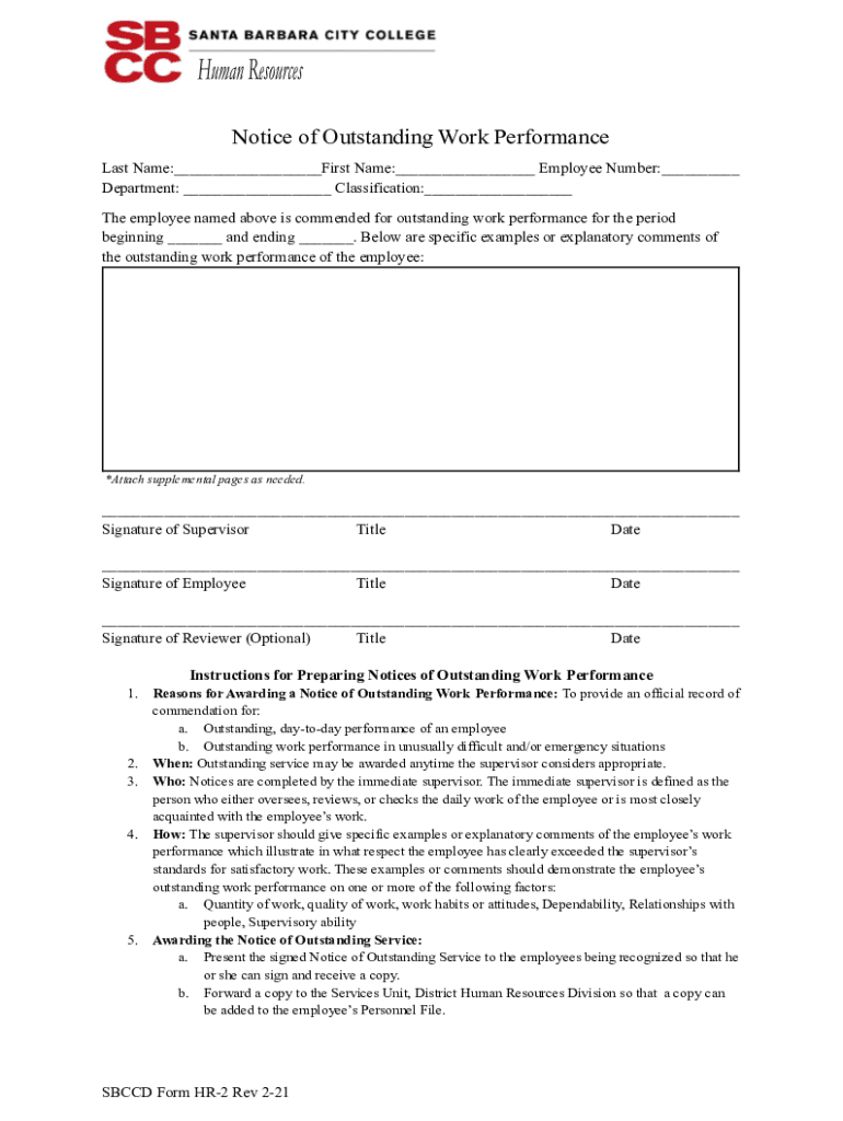 Notice of Outstanding Work Performance Last Name:___First Name:___ Employee Number:___ Department: ___ Classification:___ The employee named above is commended for outstanding work performance for