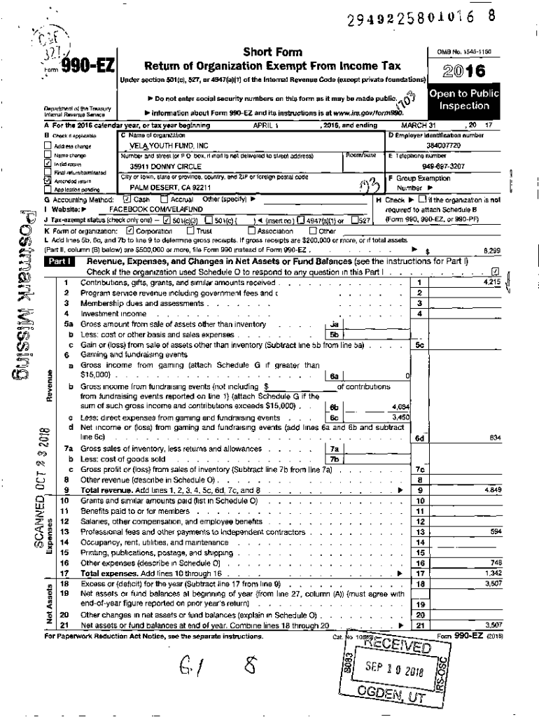 294922580\'C6 8 Short Form Return of Organization Exempt From Income Reinform \'490EZOMB No. 1545115020016Under section 501 (c), 527, or 4947 (a)(1) of the Internal Revenue Code (except private foundations)