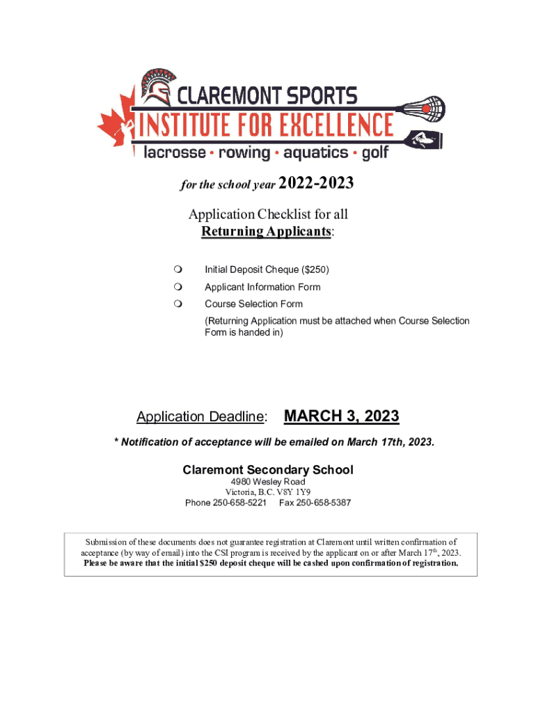 For the school year 20222023Application Checklist for all Returning Applicants: Initial Deposit Check ($250)Applicant Information Concourse Selection Form (Returning Application must be attached when