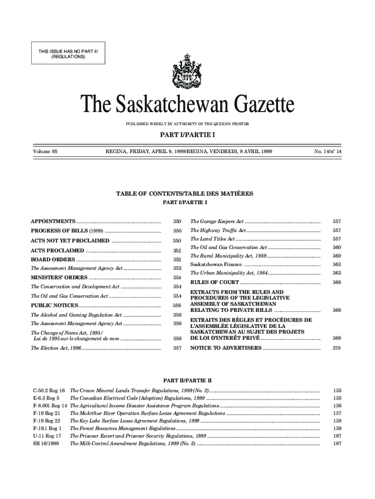 THE SASKATCHEWAN GAZETTE, APRIL 9, 1999349THIS ISSUE HAS NO PART III