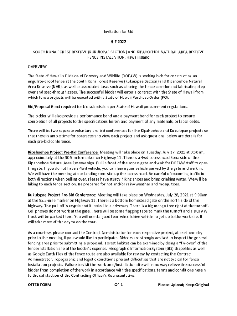 Invitation for Bid HIF 2022 SOUTH KONG FOREST RESERVE (KUKUIOPAE SECTION) AND KIPAHOEHOE NATURAL AREA RESERVE FENCE INSTALLATION, Hawaii Island OVERVIEW The State of Hawaii's Division of Forestry