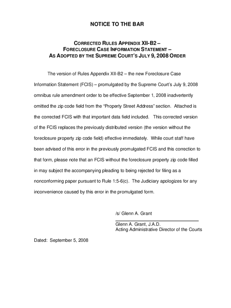 NOTICE TO THE CORRECTED RULES APPENDIX XIIB2 FORECLOSURE CASE INFORMATION STATEMENT AS ADOPTED BY THE SUPREME COURTS JULY 9, 2008, ORDER The version of Rules Appendix XIIB2 the new Foreclosure Case