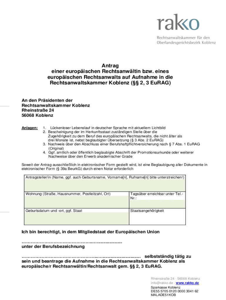 Rechtsanwaltskammer Koblenz (2, 3 Eu RAG)An den President her