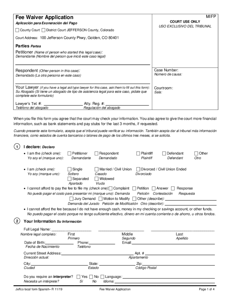 Miffed Waiver ApplicationCOURT USE ONLY USO EXCLUSIVE DEL TRIBUNALAplicacin para Exonerating Del Pago County Court District Court Jefferson County, Colorado Court Address: 100 Jefferson County Pkwy,