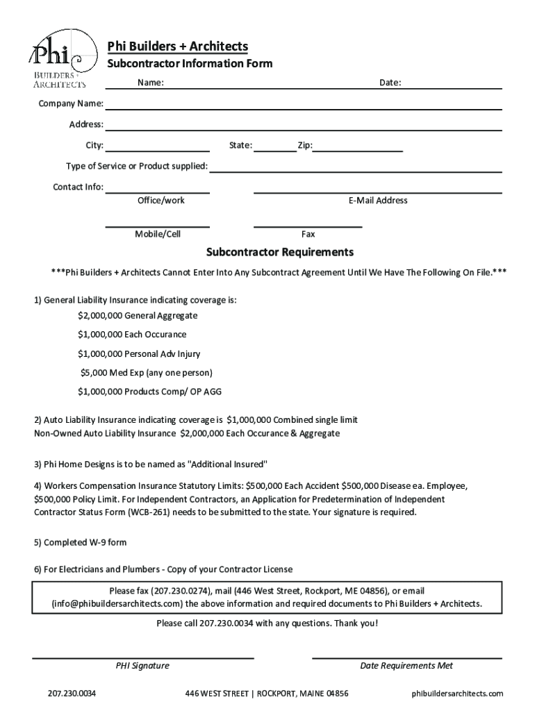 Phi Builders + Architects Subcontractor Information Form Name:Date:Company Name: Address: City:State:Zip:Type of Service or Product supplied: Contact Info: Office/Workman Address Mobile/CellFaxSubcontractor