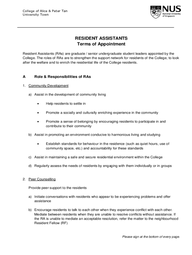 Get the free RESIDENT ASSISTANTS Terms of Appointment - capt nus edu