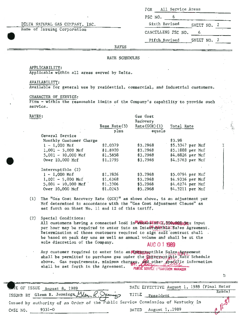 FORAll Service Area s6 PSC NO. Sixth Rev isedDELTA NATURE. L GAS CO!:P.t1NY, INC. Name of Issuing Corp orations:.:ET NO. 2CANCELLING PSC NO. Fifth Revised6SHEET NO.2RATES RATE SCHEDULES APPLICABILITY: