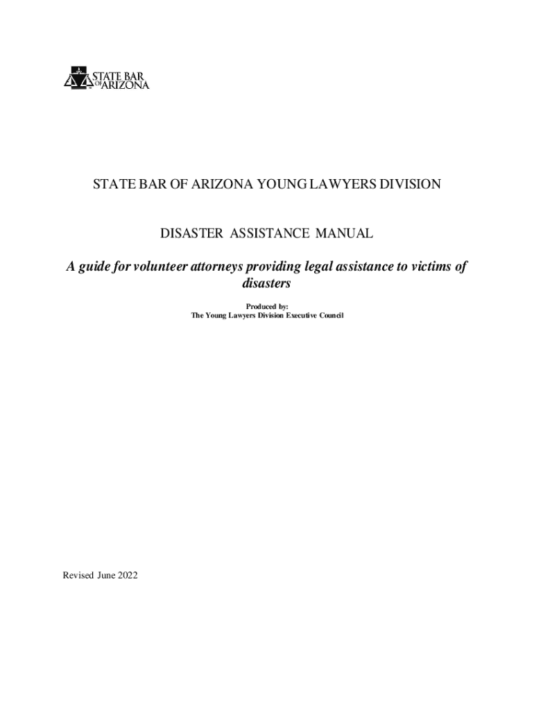 STATE BAR OF ARIZONA YOUNG LAWYERS DIVISIONDISASTER ASSISTANCE MANUAL A guide for volunteer attorneys providing legal assistance to victims of disasters Produced by: The Young Lawyers Division Executive