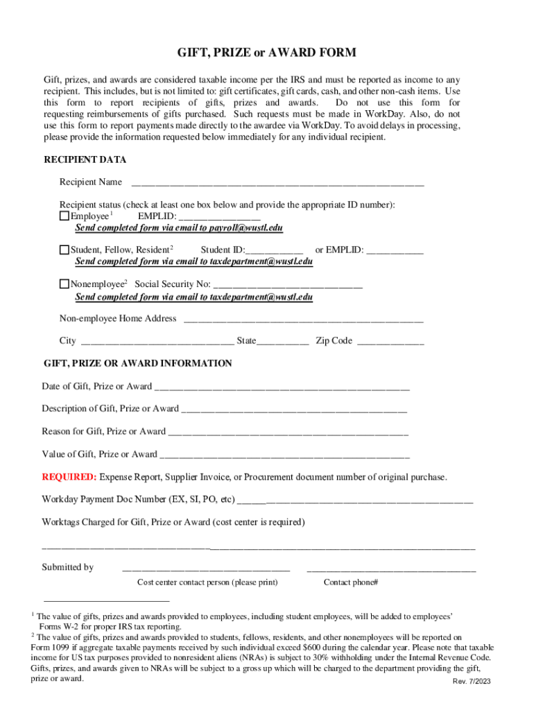 Gift, prizes, and awards are considered taxable income per the IRS and must be reported as income to any