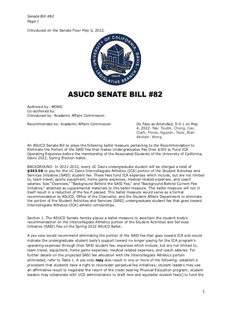 Senate Bill #82-Page 1 Introduced on the Senate Floor May 6, 2022. Authored by: WONG Coauthored by: Introduced by: Academic Affairs Commission Recommended by: Academic Affairs Commission Pass as Amended,