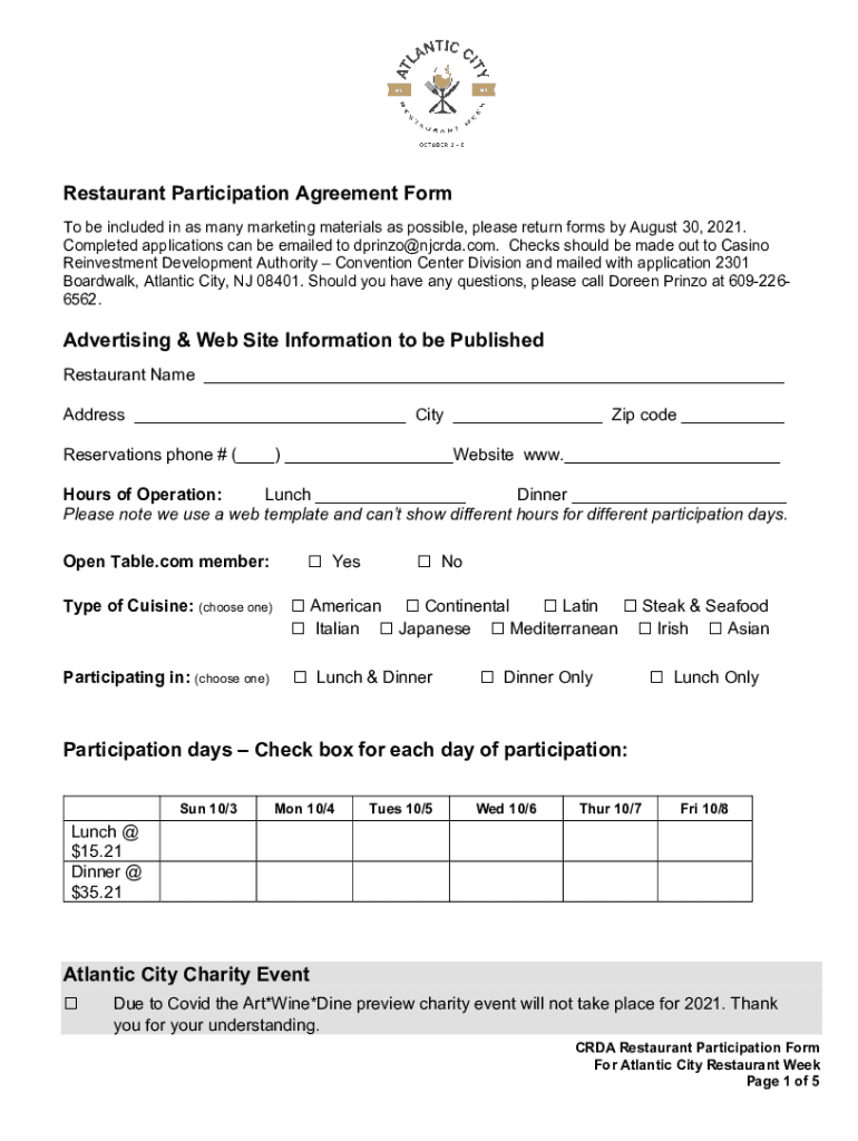 Restaurant Participation Agreement Form To be included in as many marketing materials as possible, please return forms by August 30, 2021. Completed applications can be emailed to dprinzo@njcrda.com.