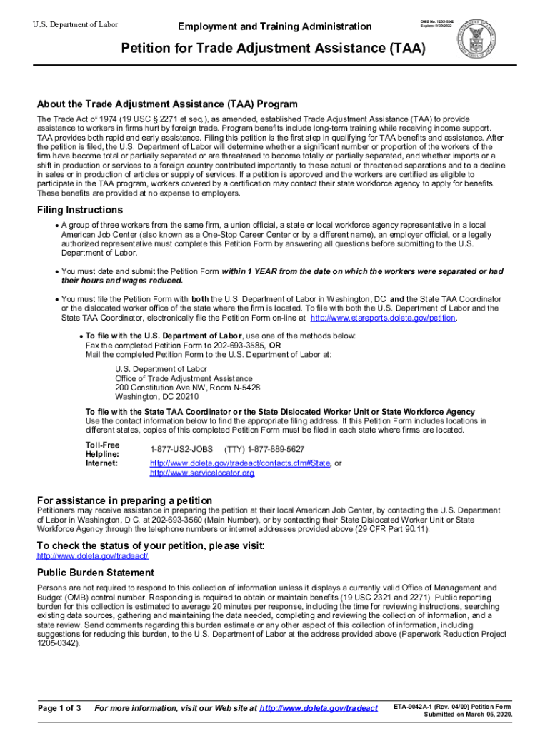 Expires: 9/30/2022Petition for Trade Adjustment Assistance (TAA)
