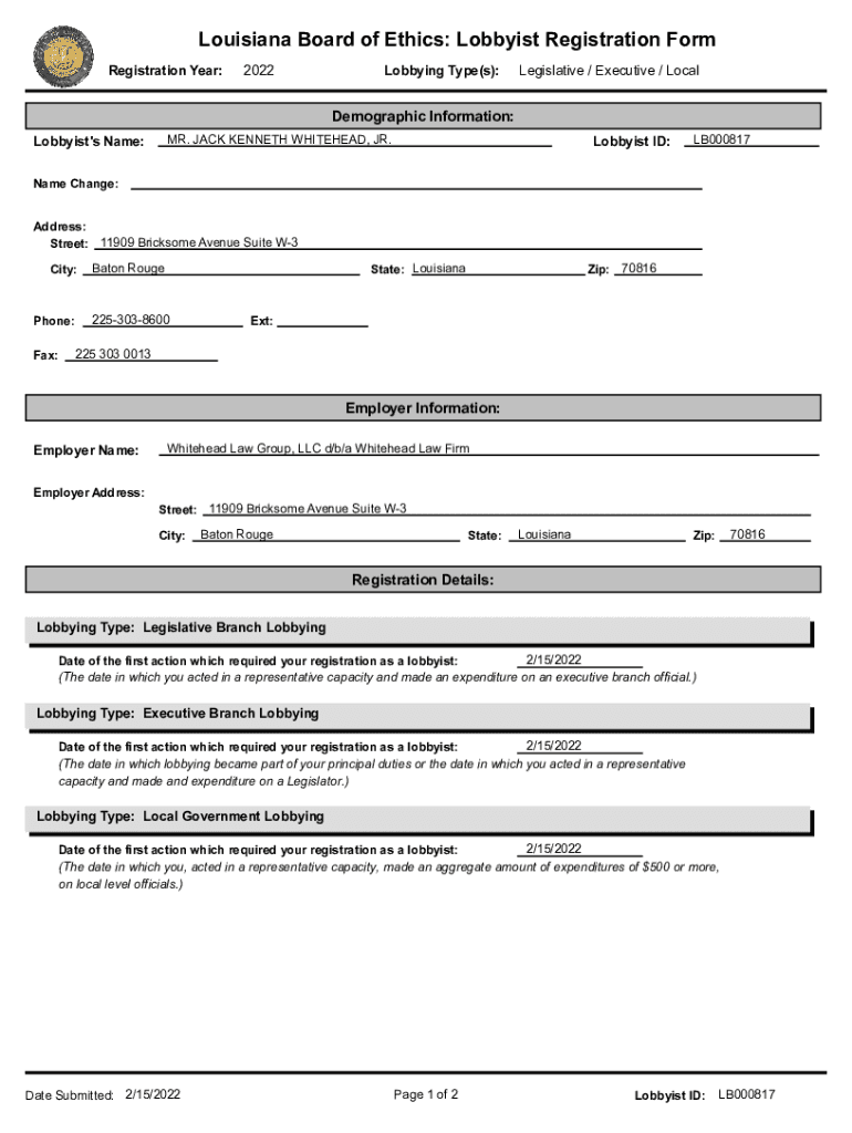 Louisiana Board of Ethics: Lobbyist Registration Form Registration Year:2022Lobbying Type(s):Legislative / Executive / Sociodemographic Information: MR. JACK KENNETH WHITEHEAD, JR. Lobbyist\'s Name:Lobbyist