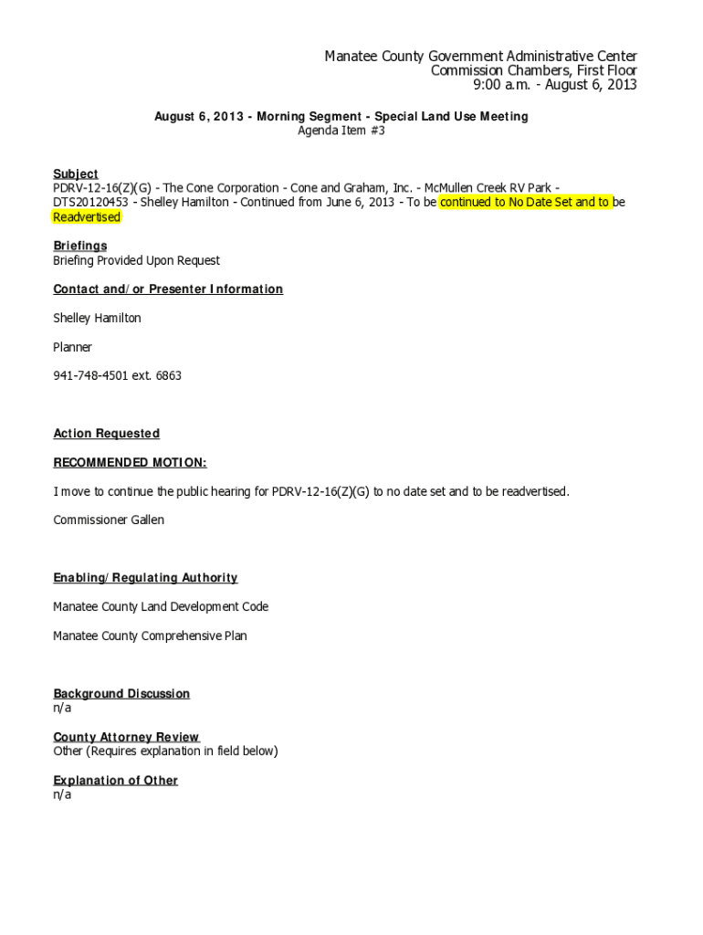 Manatee County Government Administrative Center Commission Chambers, First Floor 9:00 a.m. August 6, 2013, August 6, 2013, Morning Segment Special Land Use Meeting Agenda Item #3 Subject PDRV1216(Z)(G)