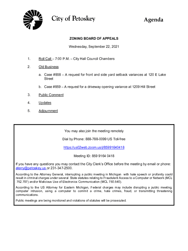 Agenda ZONING BOARD OF APPEALS Wednesday, September 22, 2021 1. Roll Call 7:00 P.M. City Hall Council Chambers2. Old Business a. Case #858 A request for front and side yard setback variances at 120