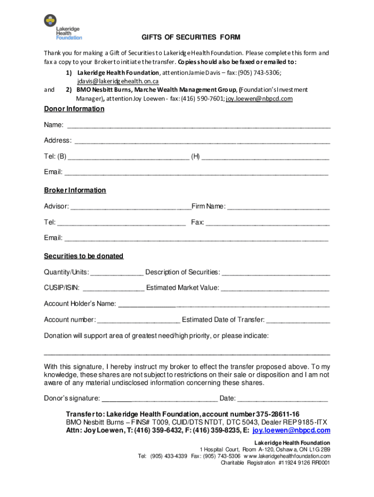 GIFTS OF SECURITIES FORM Thank you for making a Gift of Securities to Lake Ridge Health Foundation. Please complete this form and fax a copy to your Broker to initiate the transfer. Copies should