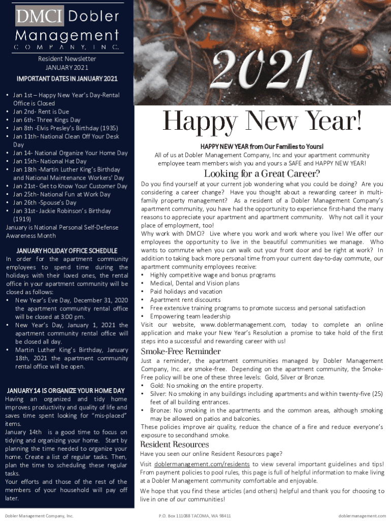 Resident Newsletter JANUARY 2021 IMPORTANT DATES IN JANUARY 2021 Jan 1st Happy New Years Parental Office is Closed Jan 2nd Rent is Due Jan 6th Three Kings Day Jan 8th Elvis Presley's Birthday (1935)