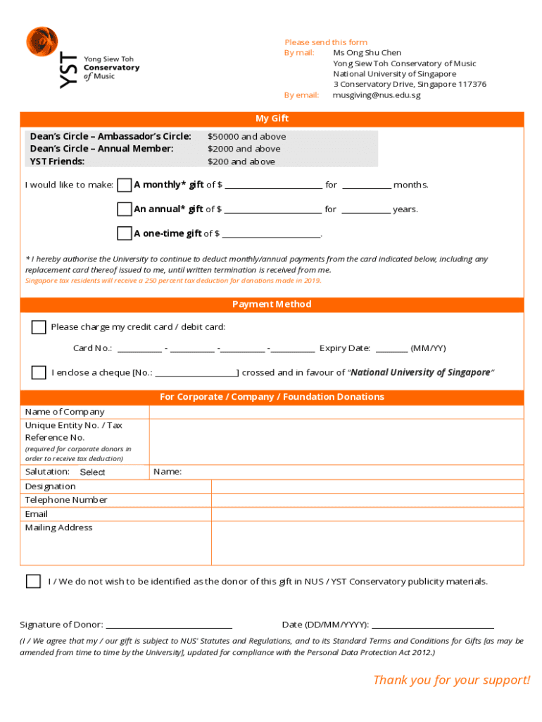 Please send this form By mail: Ms ONG SHU Chen Yong Said To Conservatory of Music National University of Singapore 3 Conservatory Drive, Singapore 117376 By email: musgiving@nus.edu.sgMy Gift Deans