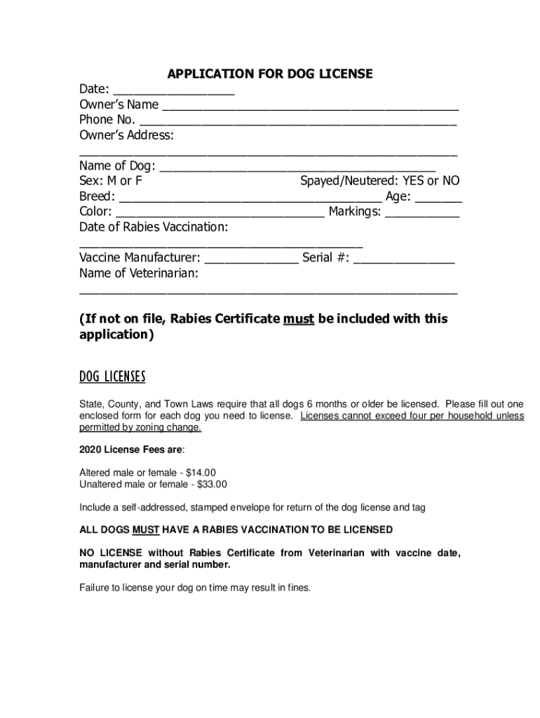 APPLICATION FOR DOG LICENSE Date: ___ Owners Name ___ Phone No. ___ Owners Address: ___ Name of Dog: ___ Sex: M or F Spayed/Neutered: YES or NO Breed: ___ Age: ___ Color: ___ Markings: ___ Date of