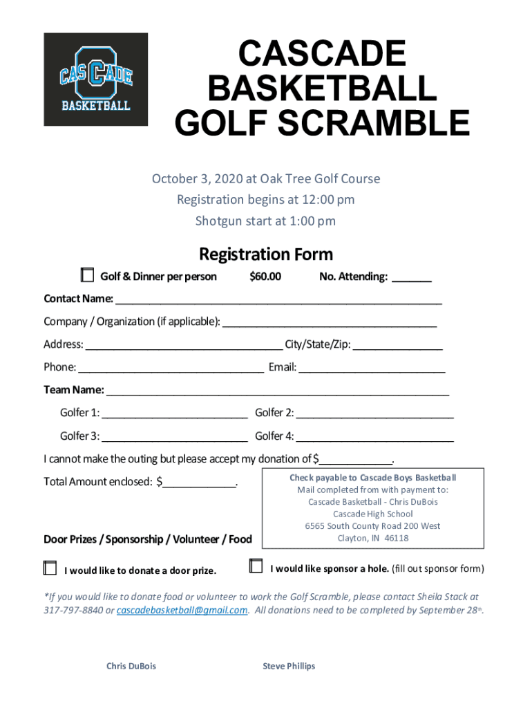 CASCADE BASKETBALL GOLF SCRAMBLE October 3, 2020, at Oak Tree Golf Course Registration begins at 12:00 pm Shotgun start at 1:00 registration Form Golf & Dinner per person$60.00No. Attending: ___Contact