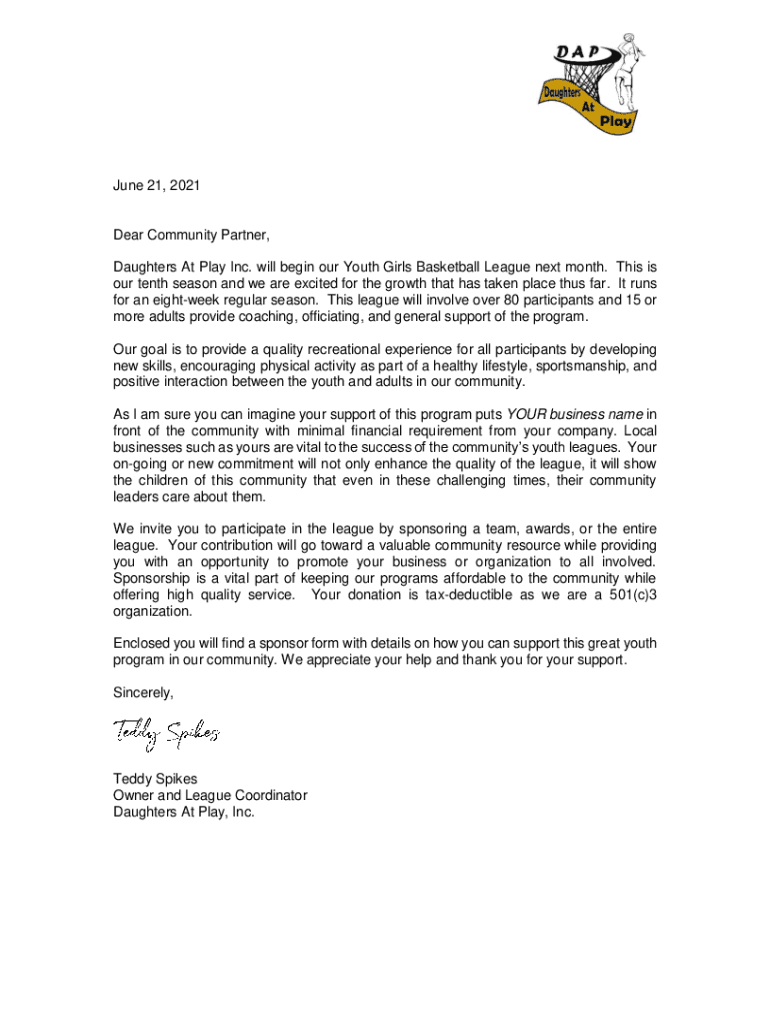 June 21, 2021Dear Community Partner, Daughters At Play Inc. will begin our Youth Girls Basketball League next month. This is our tenth season, and we are excited for the growth that has taken place