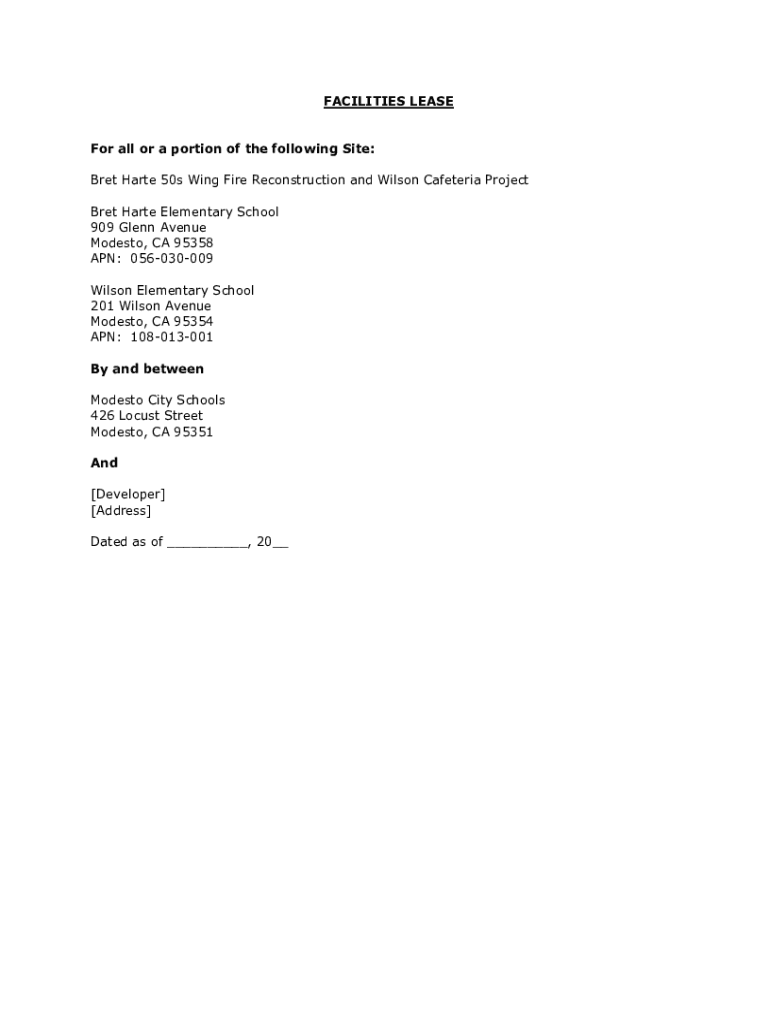 FACILITIES LEASE For all or a portion of the following Site: Bret Harte 50s Wing Fire Reconstruction and Wilson Cafeteria Project Bret Harte Elementary School 909 Glenn Avenue Modesto, CA 95358 APN: