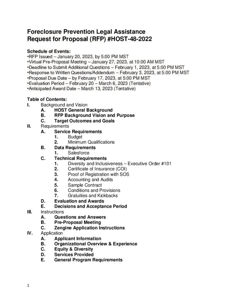 Foreclosure Prevention Legal Assistance Request for Proposal (RFP) #HOST482022 Schedule of Events: RFP Issued January 20, 2023, by 5:00 PM MST Virtual Proposal Meeting January 27, 2023, at 10:00 AM