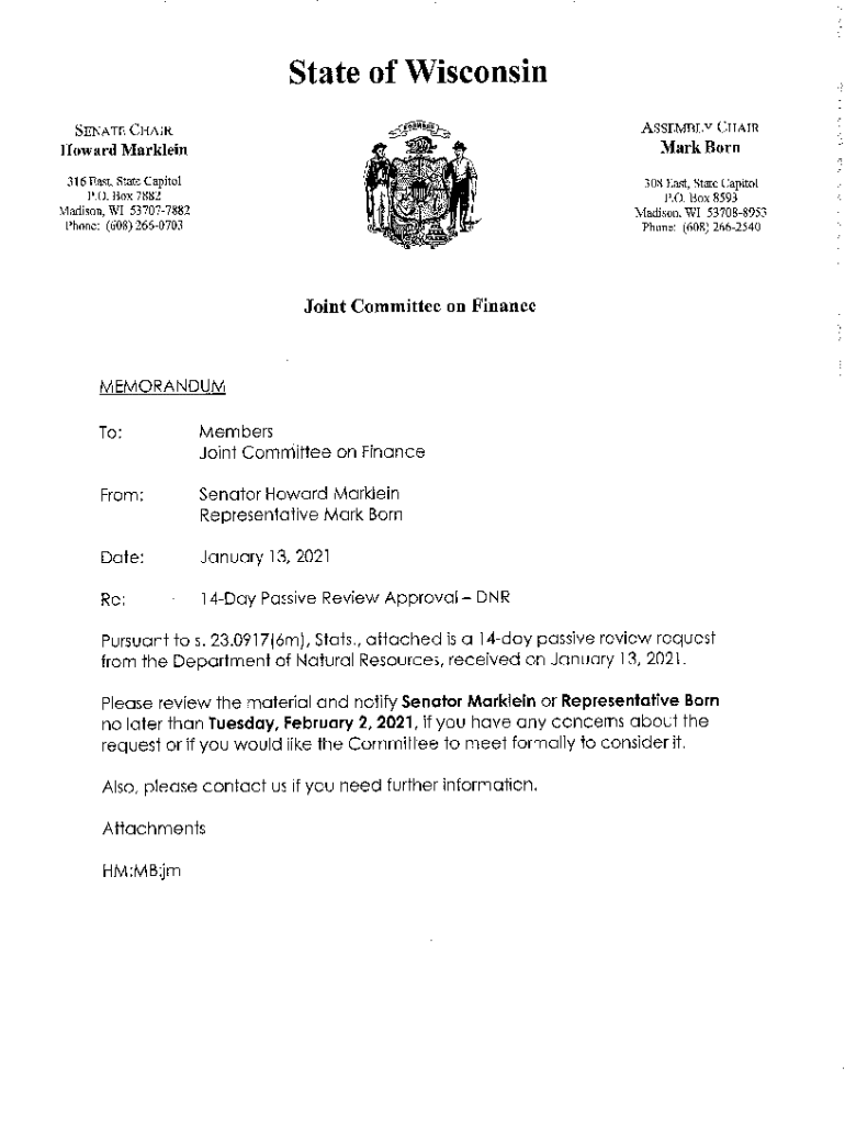 DATE:January 4, 2021TO:Members of the Joint Committee on FinanceFROM:Preston Cole, SecretaryState of WisconsinSUBJECT: