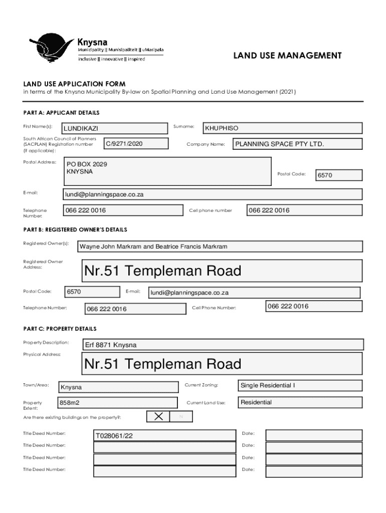 LAND USE MANAGEMENT LAND USE APPLICATION FORM in terms of the Kṛṣṇa Municipality Bylaw on Spatial Planning and Land Use Management (2021)PART A: APPLICANT DETAILS First Name(s):Surname:LUNDIKAZISouth
