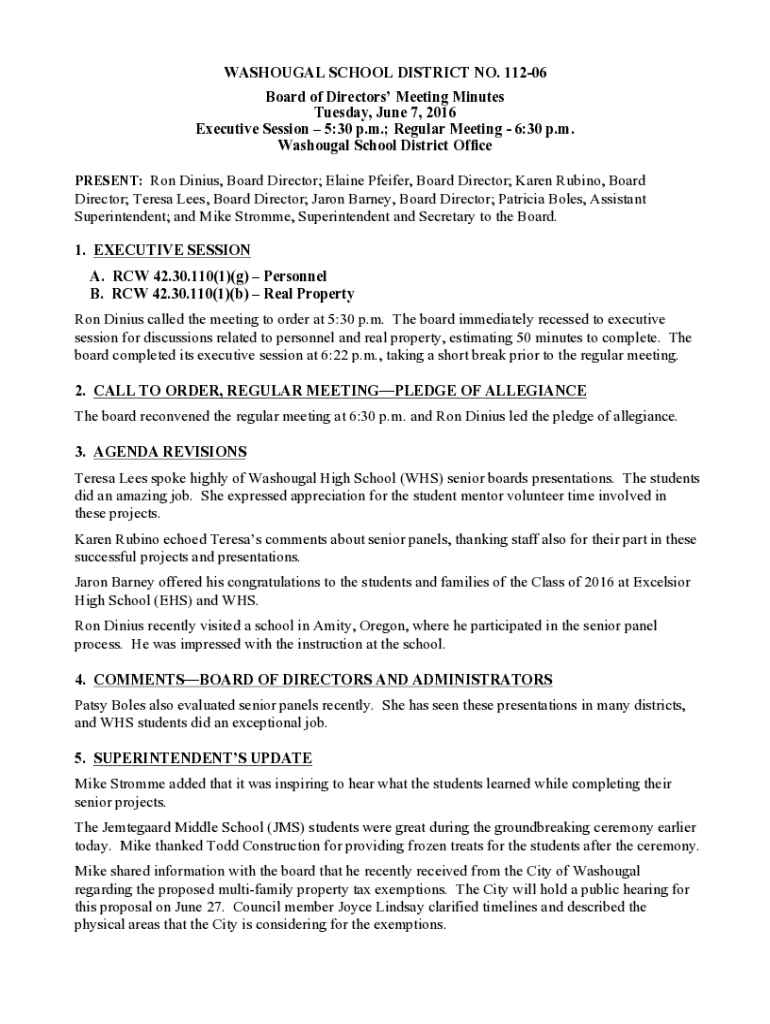 Executive Session 5:30 p.m.; Regular Meeting 6:30 p.m.