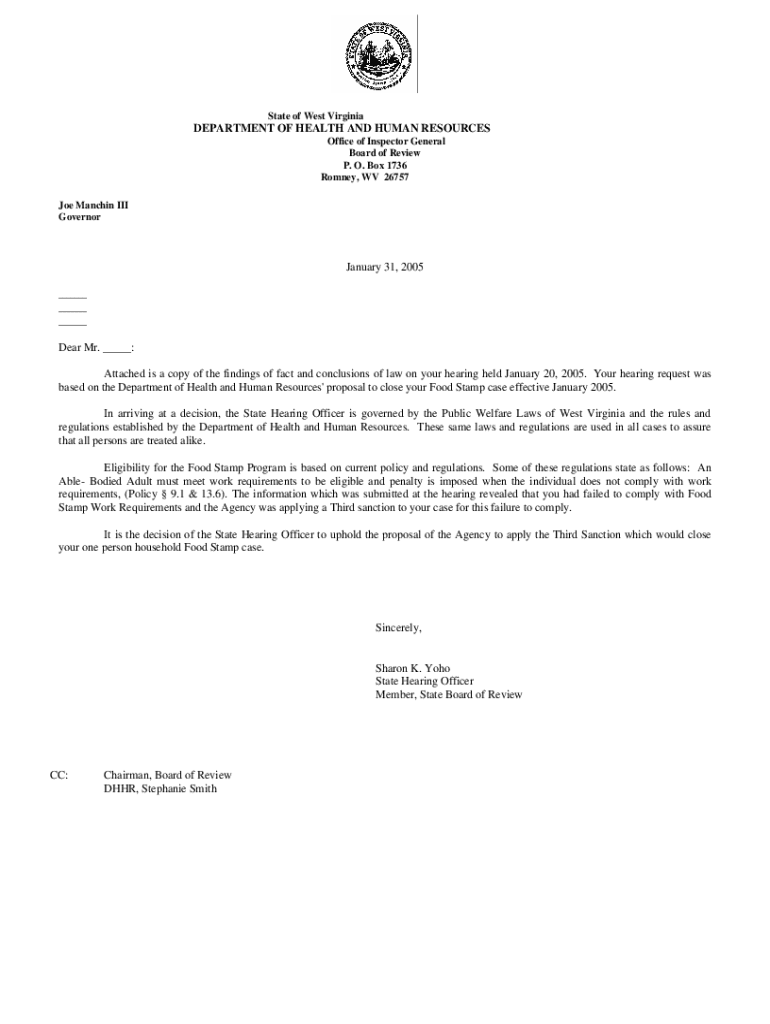 State of West VirginiaDEPARTMENT OF HEALTH AND HUMAN RESOURCES Office of Inspector General Board of Review P. O. Box 1736 Romney, WV 26757 Joe Man chin III Governor January 31, 2005 ___ ___ ___ Dear