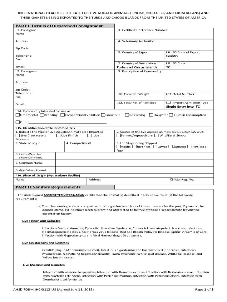 INTERNATIONAL HEALTH CERTIFICATE FOR LIVE AQUATIC ANIMALS (FINISH, Mollusks, AND CRUSTACEANS) AND THEIR GAMETES BEING EXPORTED TO THE TURKS AND CARLOS ISLANDS FROM THE UNITED STATES OF AMERICANA I: