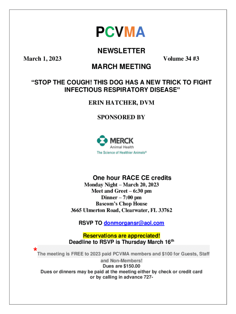 PC VMA NEWSLETTER March 1, 2023Volume 34 #3MARCH MEETING STOP THE COUGH! THIS DOG HAS A NEW TRICK TO FIGHT INFECTIOUS RESPIRATORY DISEASE ERIN HATCHER, DVM SPONSORED Bone hour RACE CE credits Monday