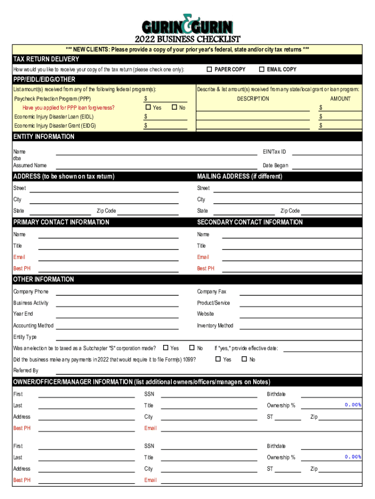2022 BUSINESS CHECKLIST *** NEW CLIENTS: Please provide a copy of your prior year\'s federal, state and/or city tax returns ***TAX RETURN DELIVERY o PAPER Copy would you like to receive your copy