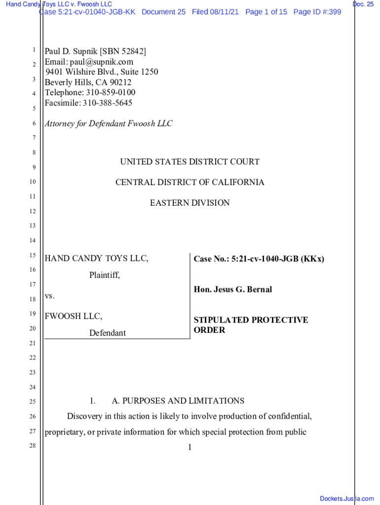 Hand Candy Toys LLC v. Swoosh ZocDoc. 25Case 5:21cv01040JGBKK Document 25 Filed 08/11/21-Page 1 of 15-Page ID #:3991 2 3 4 5 6Paul D. Sunk [SON 52842] Email: paul@supnik.com 9401 Wilshire Blvd., Suite