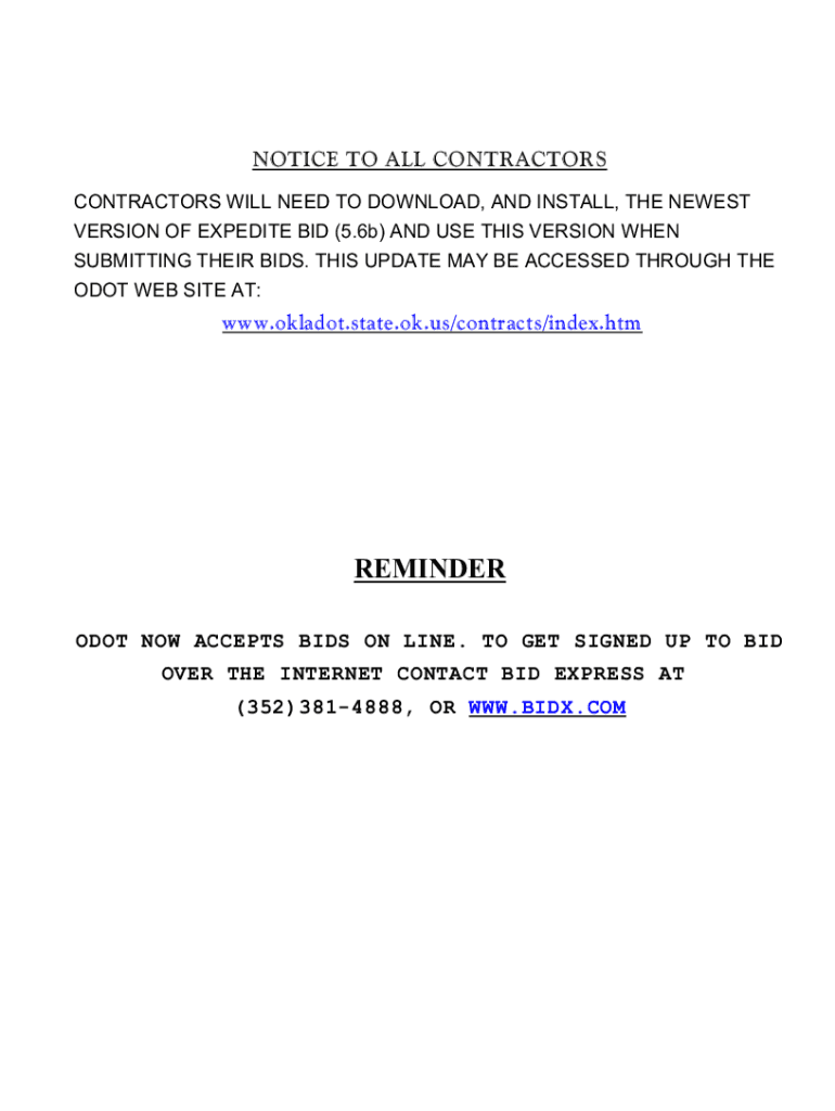 NOTICE TO ALL CONTRACTORS WILL NEED TO DOWNLOAD, AND INSTALL, THE NEWEST VERSION OF EXPEDITE BID (5.6b) AND USE THIS VERSION WHEN SUBMITTING THEIR BIDS. THIS UPDATE MAY BE ACCESSED THROUGH THE DOT