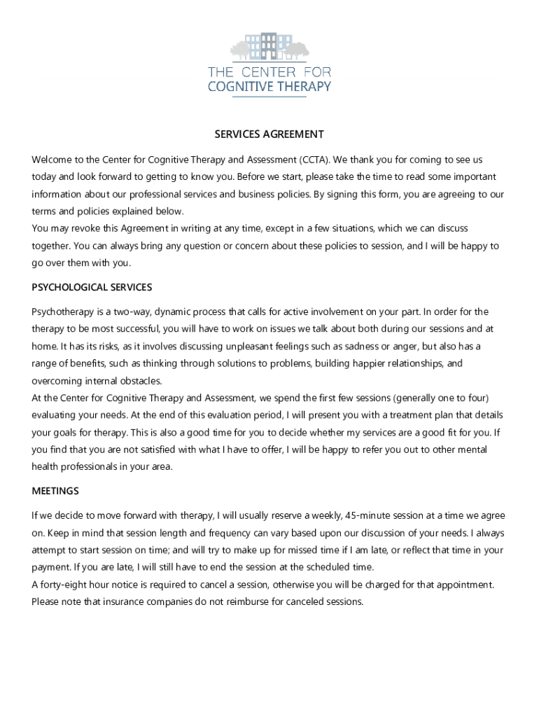 SERVICES AGREEMENT Welcome to the Center for Cognitive Therapy and Assessment (CCTV). We thank you for coming to see us today and look forward to getting to know you. Before we start, please take